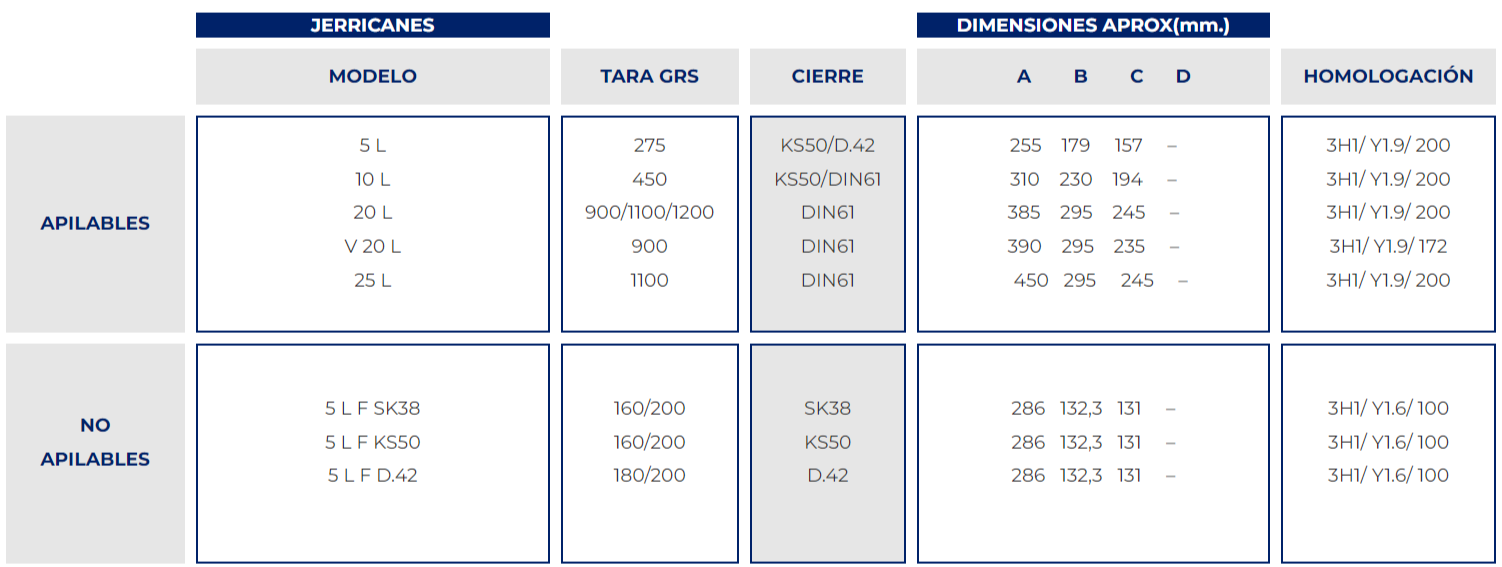 | JERRICANES | DIMENSIONES APROX(mm.) | ||||